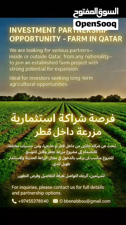 We are looking for serious partners—inside or outside Qatar, from any nationality—to join an established farm project with strong potential for expansion.